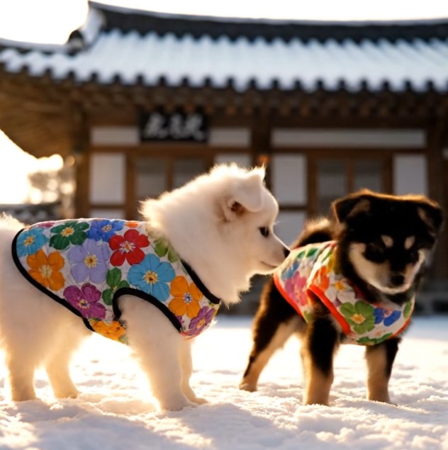 하얀 눈이 가득 쌓인 한옥 마당에서 모니와 젠이 화려한 꽃무늬 누빔 조끼를 입고 나타났습니다. 일명 '김장조끼'라고 불리는 이 레트로한 의상은 모니의 하얀 털과 젠의 듬직한 모색에 대비되어 그야말로 '동네 패피' 포스를 뿜어내는데요.