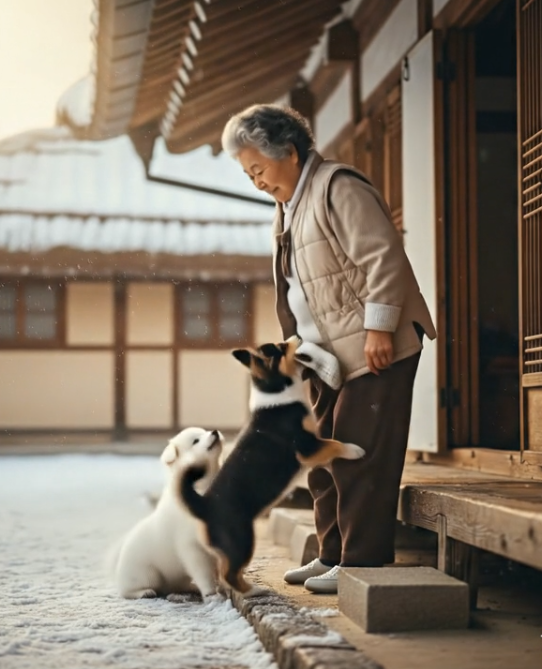 뒤이어 하얀 솜뭉치 같은 '모니'도 합세합니다. 신발을 뺏긴 할머니가 허탈해하며 툇마루에 앉으시자, 두 녀석은 기다렸다는 듯이 할머니 품으로 파고듭니다. "신발도 없으신데 그냥 저희랑 놀아요~"라고 말하는 듯한 꼬리 치기와 애교 섞인 몸짓에 결국 할머니도 외출을 포기하고 웃음을 터뜨리고 마십니다. 눈 내리는 한옥 마당에서 펼쳐진 이 짧은 소동은 보는 이들의 마음을 단번에 녹여버립니다.